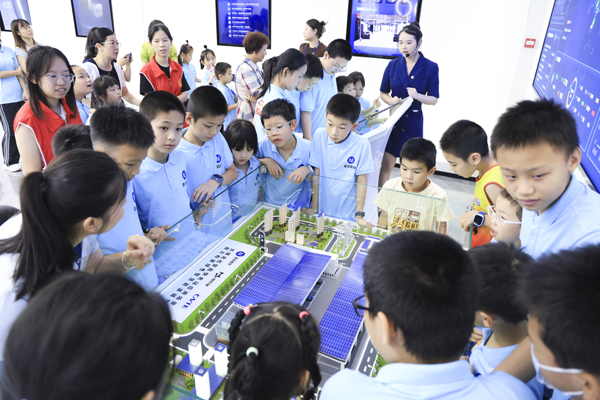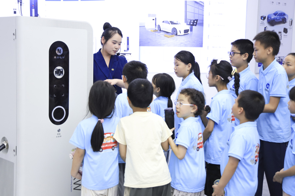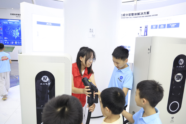 宣傳片觀看結束后,孩子們最期待的展廳探秘環節正式開始。在講解員和志愿者的帶領下,孩子們步入了展廳,沉浸式感受科技的魅力。講解員用生動易懂的語言,結合香港大學志愿者們的實物操作演示,將復雜的鋰電池檢測技術、新能源汽車充電技術講述得妙趣橫生、直白易懂。孩子們興致勃勃,認真聆聽講解。